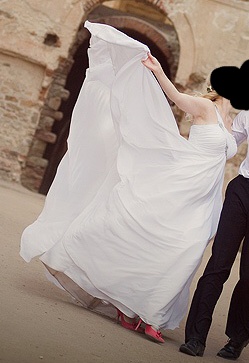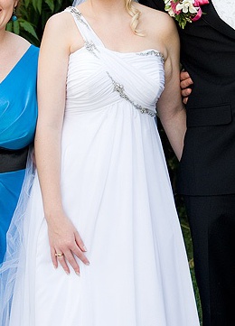 Rozmiar 38/40/42 - wielkość biustu B/C. Wzrost 160 cm + obcas 7-10cm. Zwiewna i delikatna suknia w stylu Empire - odcinana pod biustem. Kolor zimna biel. Delikatny tren z możliwością noszenia na palcu lub podpięcia do bransoletki. Z tyłu gorset i zamek - pozwala manipulować rozmiarem sukni. Na gorsecie ręcznie wykonane hafty z koralików i kryształków. Posiadam do niej długi 1,50m welon i oryginalną ozdobę do włosów, oraz malinowe pantofelki - 11cm obcas.