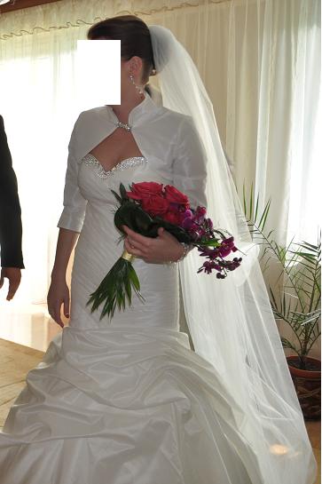Suknia szyta ręcznie i wysadzana kryształami swarovskiego,model wyszczuplający. Suknia dopasowuje się do ciała i jest bardzo dobrze usztywniona.W cenie z sukienką 2 welony-długi i krótki,bolerko.Posiadam również buty w rozmiarze 38,5-39.Zainteresowanych proszę o kontakt