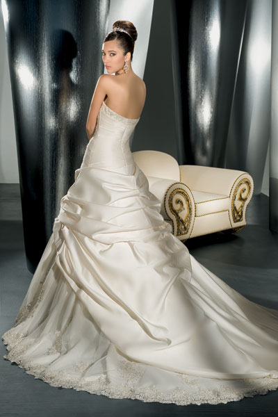 Jednoczęściowa z pięknym podpinanym trenem (do sukni przyszyte są guziczki, do których podpina się tren). Jest to suknia o linii A z odkrytymi ramionami, wiązana, przez co idealnie podkreśla kobiece kształty. Ozdobiona jest haftami i kryształkami. Jest wygodna i nie krępuje ruchów.