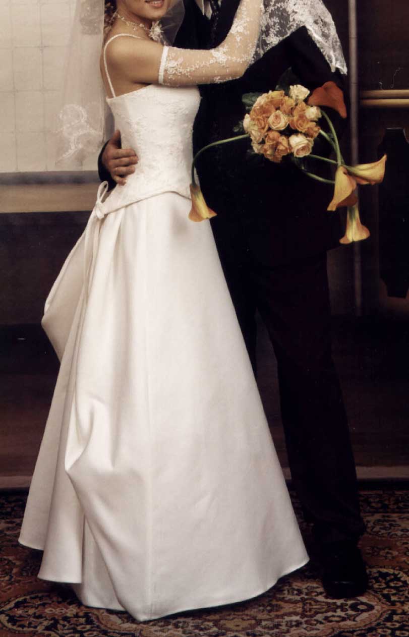-spódnica gładka, atłasowa (bardzo lekko błyszcząca), zapinana z tylu na suwak i guzik- dwa stopnie regulacji; długi tren podpinany, który można tradycyjnie upiąć w "kuperek", co pozwala swobodnie się poruszać.
