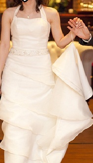 Ma doszyte ramiączko wokół karku. Tren podpinany na guzik lub wstążkę. Zapinana na zamek, z tyłu niewielka kokarda.