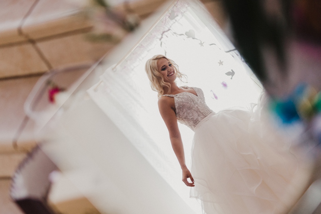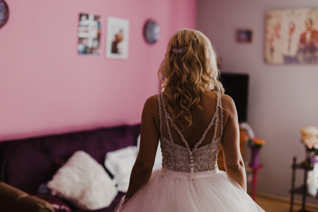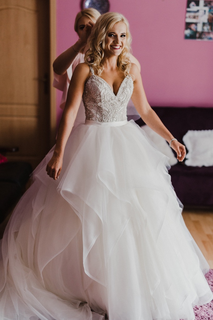 Przepiękny gorset z kryształkami, wysadzany kamieniami. Dół sukni składa się z falban. Tył sukni tworzy piękny tren.