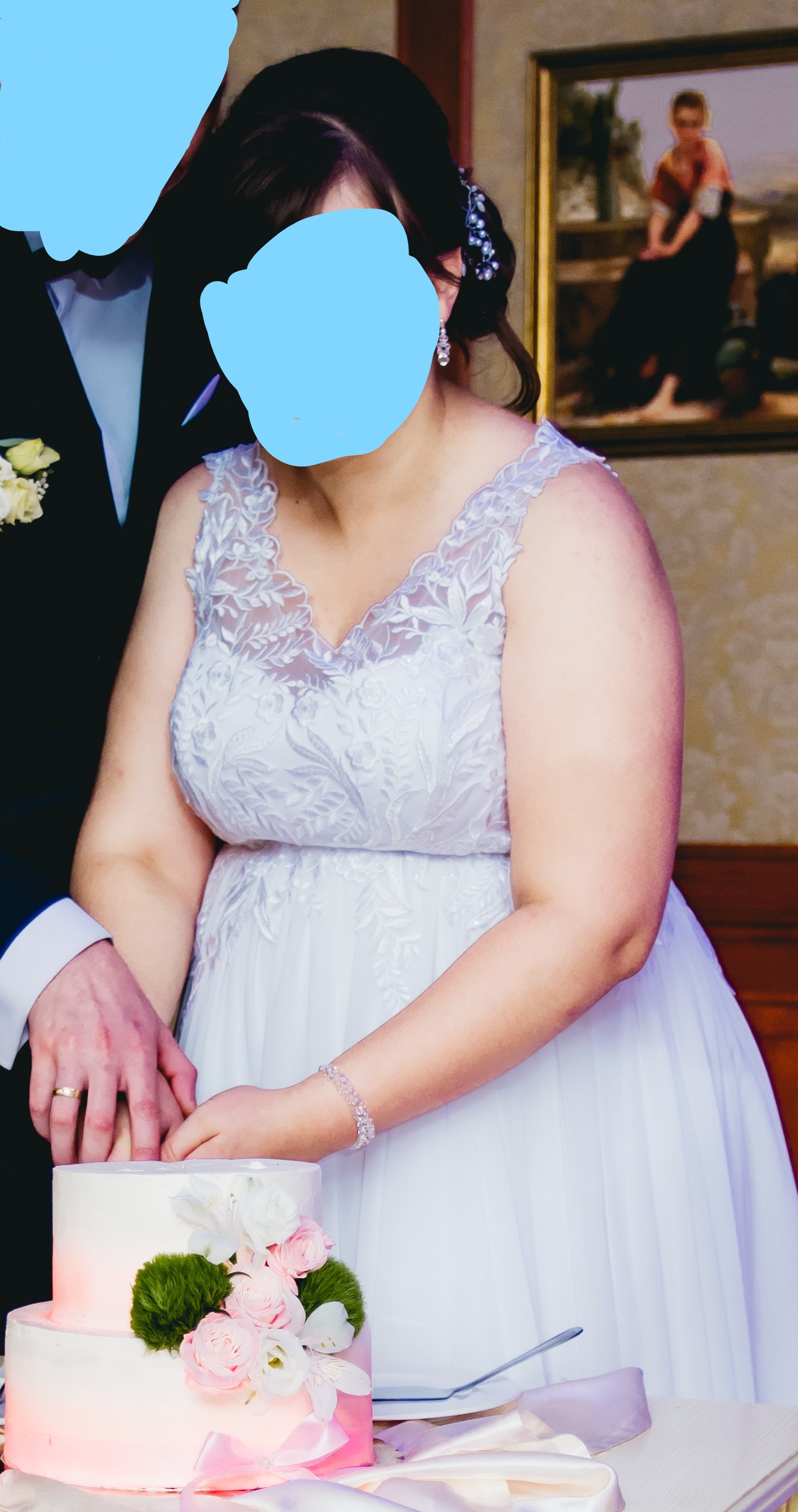 Sprzedam suknię ślubną. Suknia ubrana tylko raz w lipcu 2019, szyta na wzrost 165 cm + 7 cm obcas. Spokojnie zmieści duży brzuszek ciążowy (na zdjęciach 7. miesiąc). Kolor śnieżnobiały. Sukienka z satyny z tiulową koszulką. Na spódnicy marszczony muślin. Satynowy gorset odcinany pod biustem. Dodatkową warstwą jest podszewka. Zapięcie na zamek, koszulka zapinana na 25 perłowych guzików. Koronka przyszywana ręcznie, a nie klejona jak przy większości sukien ślubnych.