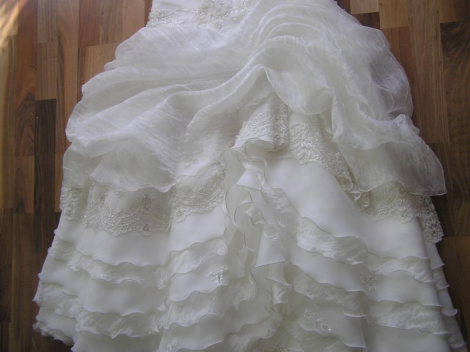 suknia , którą chciałabym zaproponować do sprzedaży została uszyta we wrześniu 2009r. w renomowanym salonie Kreacje Żanet-model Paradais. W całości ozdobiona jest koralikami i kryształkami, dzięki którym wyjątkowo mieni się zarówno w promieniach słońca jak i sztucznym świetle lamp i świec. Tiulowy gorset (łącznie z dołączonymi ramiączkami) wyszywany jest koronkowymi aplikacjami.
