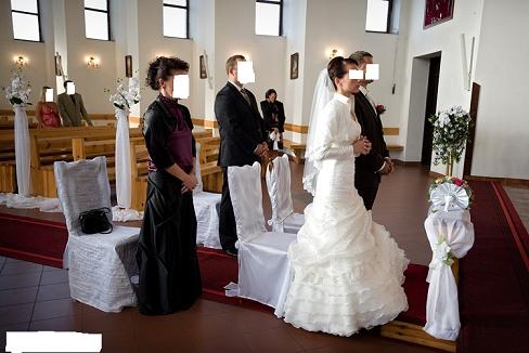 Rozmiar 34/36 na wzrost 166cm + obcas ok. 7 cm. Istnieje możliwość dokonania przeróbek bez utraty fasonu. Ubrana tylko raz, stan idealny. GRATIS satynowe bolerko! Do zestawu posiadam welon i dodatkowo futerko.