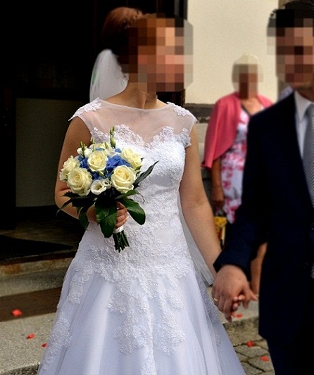 Lekko przedłużony gorset oraz dodatkowe fiszbiny wszyte również z tyłu sukni na wysokości pasa, zapewniają doskonałe modelowanie talii i znacząco poprawiają figurę panny młodej. Dekolt w kształcie serca, ze wszytymi wkładkami by uniknąć biustonosza (bardzo komfortowe rozwiązanie w ciepły, letni dzień). Sukienka zapinana na zamek. Bogate zdobienia w postaci licznych aplikacji z koronki i szklanych drobnych koralików dodają jej eleganckiego blasku (aplikacje na całym gorsecie wyciągnięte również na spódnicę).