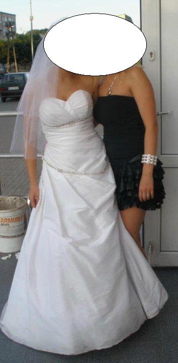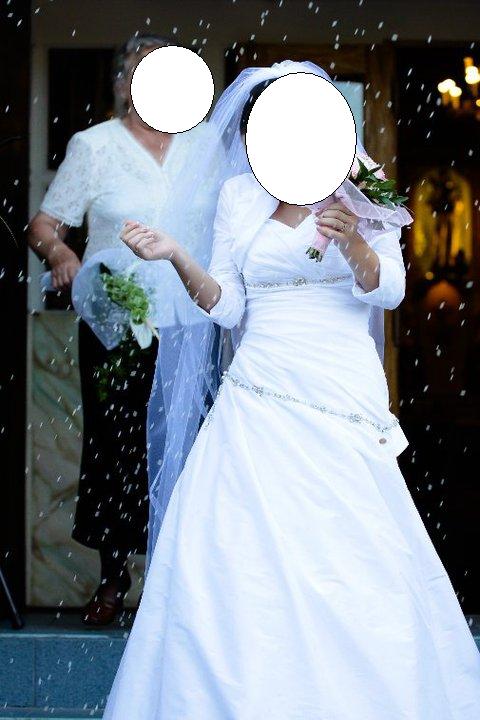 Śliczna biała suknia ślubna wykonana w całości z tafty jedwabnej. Pod biustem oraz w pasie wysadzana kryształkami. Tył gorsetowany. Idealnie sprawdziła się na weselu, wygodna i lekka. rozmiar 34/36 ,(155-163cm)