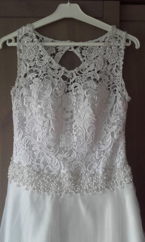 Suknia zakupiona w poprzednim sezonie w lokalnym salonie sukni ślubnych. Jestem pierwszą właścicielką i jedyną osóbką, która w ogóle mierzyła tą suknie, założona oczywiście raz ;). Góra w formie gorsetu na który jest nałożona grubsza koronka (gipiura) ozdobiona delikatnymi perełkami i koralikami srebrnymi. Talia jest podkreślona pasem z gęściej ułożonych perełek.Gorset z tyłu zasuwany na zamek i wiązany tasiemkami. Na plecach w koronce jest wycięcie w kształcie łezki co urozmaica suknie. Dół jest pokryty tiulem, który obecnie jest lekko postrzępiony, z tego co się orientowałam koszt takiej wymiany to ok 100 zł. Rozmiar określam na 36/38 bo gorset pierwotnie był w rozmiarze 36 ale później trochę poszerzony. Długość sukni jest dopasowana na 166 cm wzrostu + z 11 cm szpilek. Do sukni gratis koło. Długość sukni od ramion 150 cm, w pasie tam gdzie koraliki 80cm na luźno bo jest wstążka i można się ścisnąć a 78cm w biuście pod pachami.