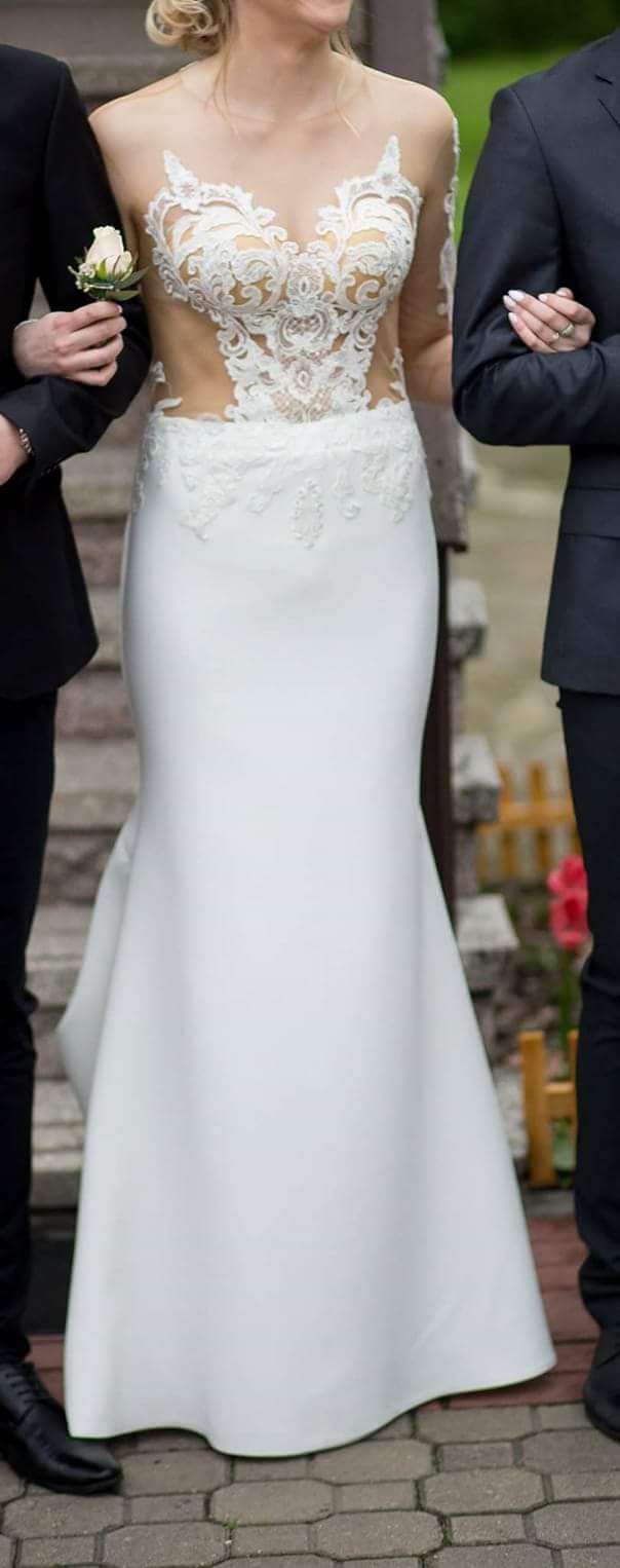 Witam, mam do sprzedania suknię ślubną Maxima Bridal 1017 z przerobionym dołem sukni na model prosty – lekko poszerzany od kolan. Suknia w kolorze ivory, ma gładki dół z podpinanym trenem na trzy guziczki. Koronkowa góra z cielistą siateczką i długim rękawem, również zdobionym aplikacją koronkową. Jest możliwość ściągnięcia aplikacji z rękawów, zostawiając samą koronkę, lub całkowite odcięcie rękawka. Tył sukni zasuwany jest na cielisty zamek i trzy guziki. Rozmiar sukni 38, wzrost 170cm + 8cm obcas. Cena do negocjacji. Na żywo robi na prawdę duże wrażenie. Stan idealny. Serdecznie polecam!