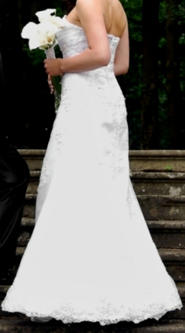 Sprzedam piękną białą suknię ślubną. Suknia raz użyta, kupiona w krakowskim salonie mody ślubnej "Estera". Szyta na miarę. Rozmiar 36-38. Wzrost 167 + obcas 6cm. Suknia jest jednoczęściowa, dół jest na małym kole. Z tyłu jest częściowo zapinana na zamek i wiązana, co pozwala na idealne dopasowanie do sylwetki i podkreślenie talii. Suknia jest zdobiona koronką i koralikami. Ma wszyte ramiączka, które można wyjąć lub schować. Jest po czyszczeniu. Gratis mogę dodać biżuterię i pończochy.