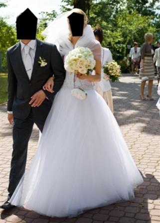 Witam wszystkie przyszłe panny młode:) Mam do sprzedania prześliczną, białą, tiulową suknię ślubną uszytą w renomowanym salonie Belcanto w Krakowie. Suknia w stylu princesski uszyta na elastycznym kole. Suknia sznurowana, u góry przyszyte kryształki przez co ślicznie się mieni. Suknia bardzo lekka i zwiewna. Można ją bez problemu skrócić na niższą osobę. Dodatkowo do sukni dorzucam piękny, długi, tiulowy welon, tiulowe bolerko, nową podwiązkę i (jeżeli ktoś ma taki rozmiar jak ja) buty ślubne rozmiar 39.