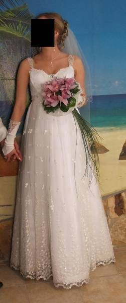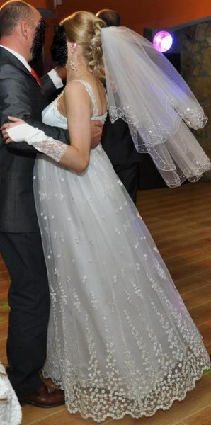 Suknia szyta była na zamówienie ma białe podbicie a na to śliczna koronka ecru co daje świetny efekt.