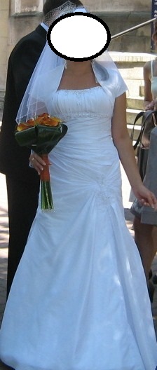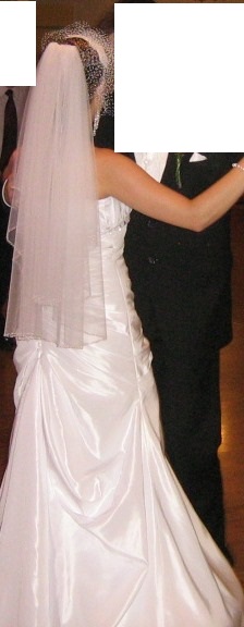 długości sukni. Suknia jednoczęściowa. Góra sukni dopasowana do linii ciała, podkreślająca linię biustu, talii i bioder z efektownymi marszczeniami. Dzięki wszytym poduszeczkom nie wymaga biustonosza. Wewnątrz znajdują się dwa pasy z gumy (zapinane tak jak biustonosz), które dodatkowo ściągają suknie, dzięki czemu bardzo dobrze się trzyma i nie opada podczas tańca. Suknia ozdobiona ręcznie wyszytą aplikacją z kryształkami Swarovskiego. Zamek sukni ukryty jest pod efektownym rzędem guziczków. Suknia jest bardzo wygodna, zwiewna oraz lekka, nie krępuje ruchów. Suknię nosi się lekko i wygodnie. Z tyłu zapinana jest na zamek błyskawiczny zakryty guziczkami. Suknia została wyczyszczona ręcznie w specjalistycznym zakładzie. Suknia koloru białego. Suknia w piękny sposób eksponuje samą pannę młodą i podkreśla jej urodę, w przeciwieństwie do wielu innych modeli sukien które niekiedy przytłaczają swoją właścicielkę. Zapraszam na przymiarkę:) Pamiętaj, że zdjęcia nie są w stanie wyrazić piękna tej sukienki.