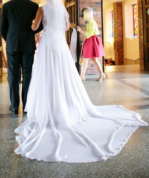 Do sukni jest długi tren dopinany na dwie niewidoczne zatrzaski wykonany z muślinu takiego jak wierzchnia warstwa sukni. Po kościele można go odpiąć w samochodzie i bawić się do białego rana bez zbędnego balastu podpiętego z tyłu. W sesji wygląda pięknie.