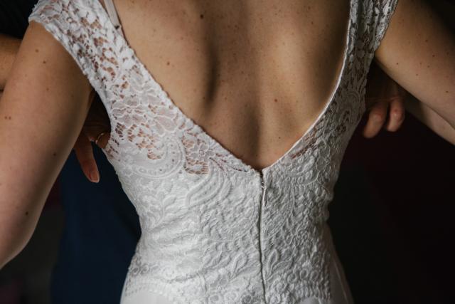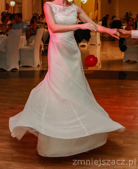 Z ozdobną koronką, założona tylko w dniu wesela - nie mieliśmy dodatkowej sesji ślubnej. Bardzo wygodna w noszeniu, lekka, pięknie się obraca w trakcie tańca, bez trenu. Z delikatną halką (lekko poszarpana, do obszycia).