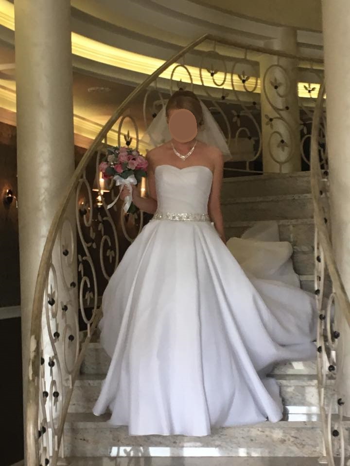 Sprzedam elegancką suknię śłubną z odpinanym trenem. Suknia zdobiona efektownymi kryształkami istnieje możliość założenia ramiączek lub koronkowewgo bolerka.