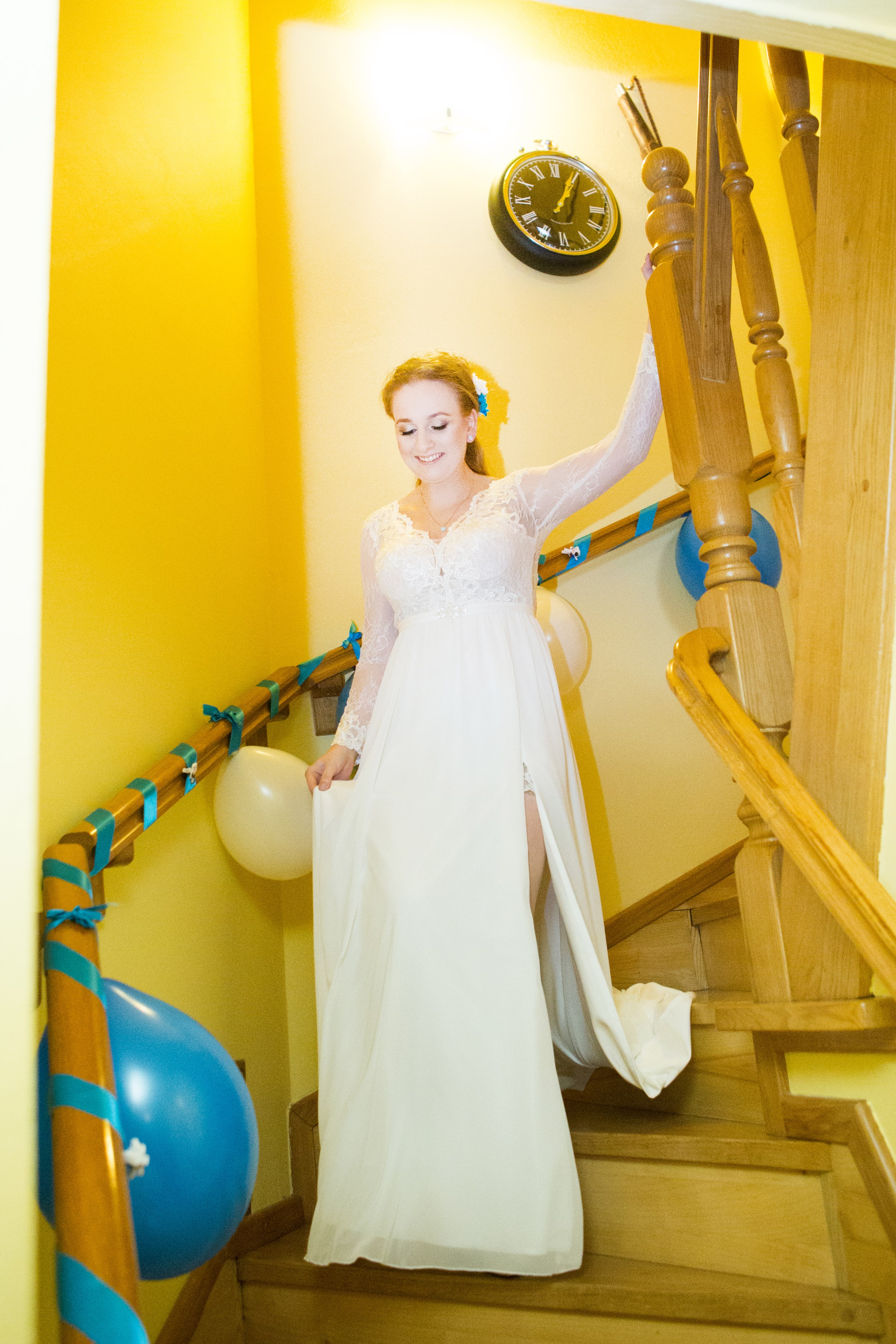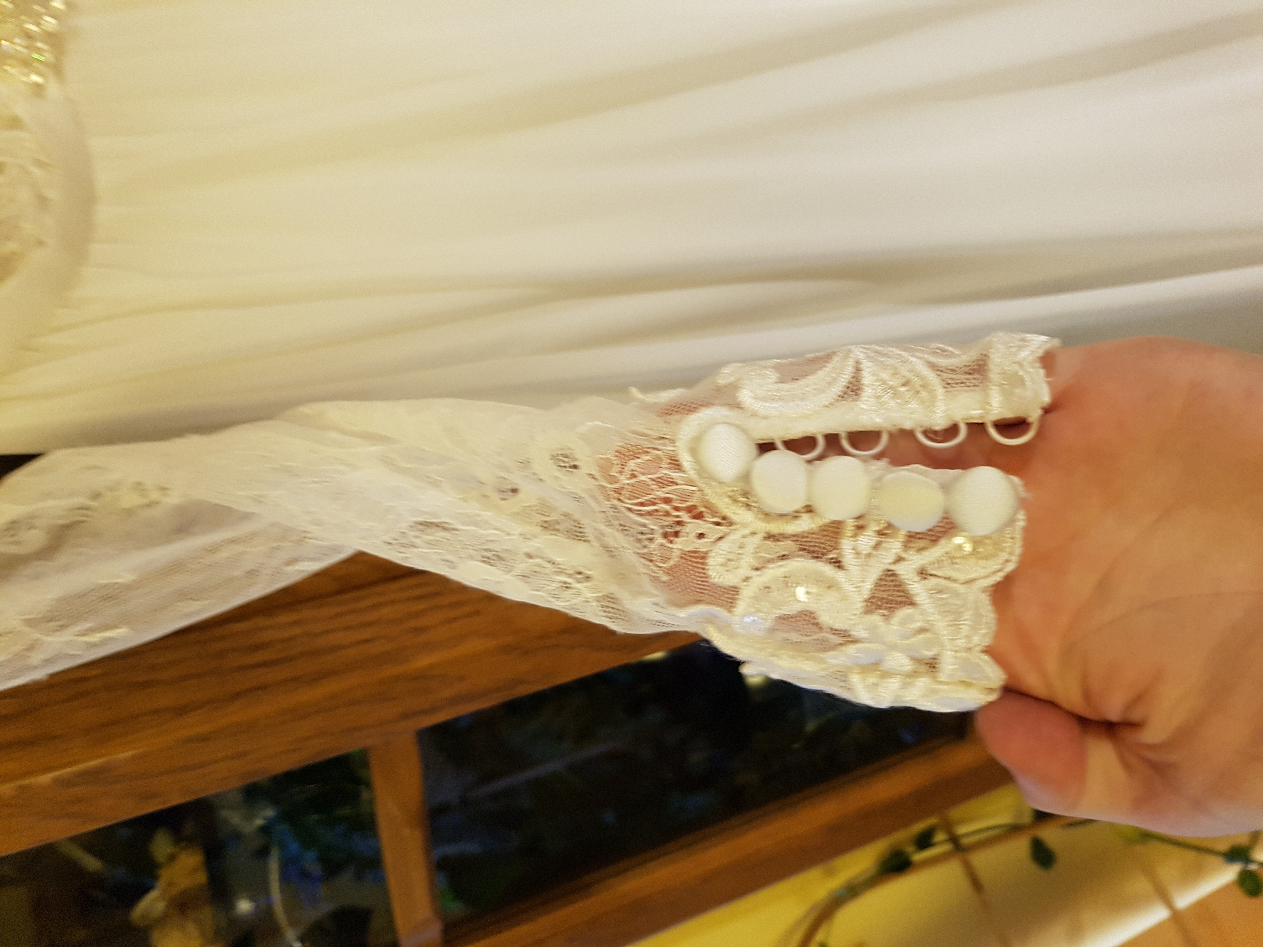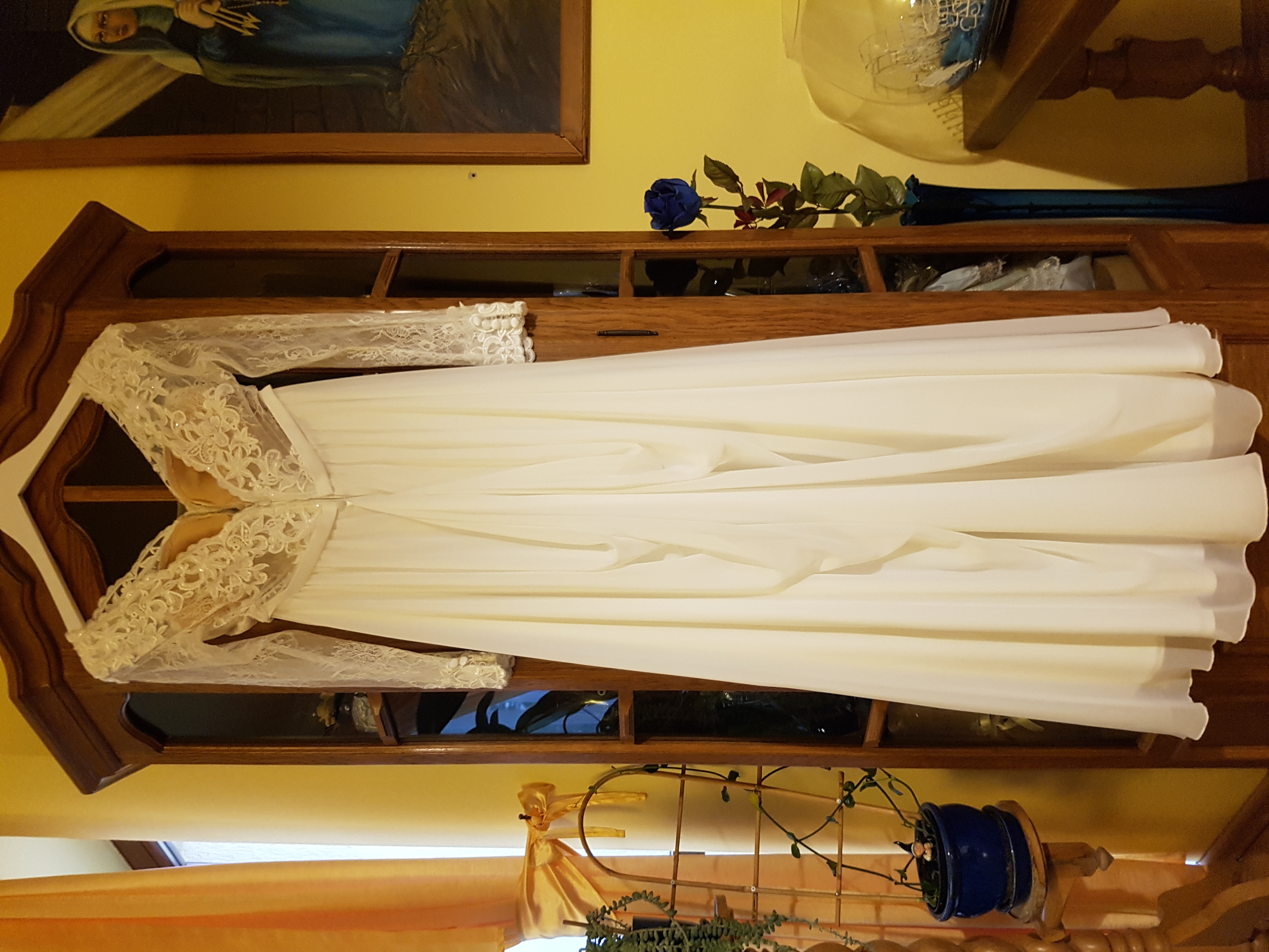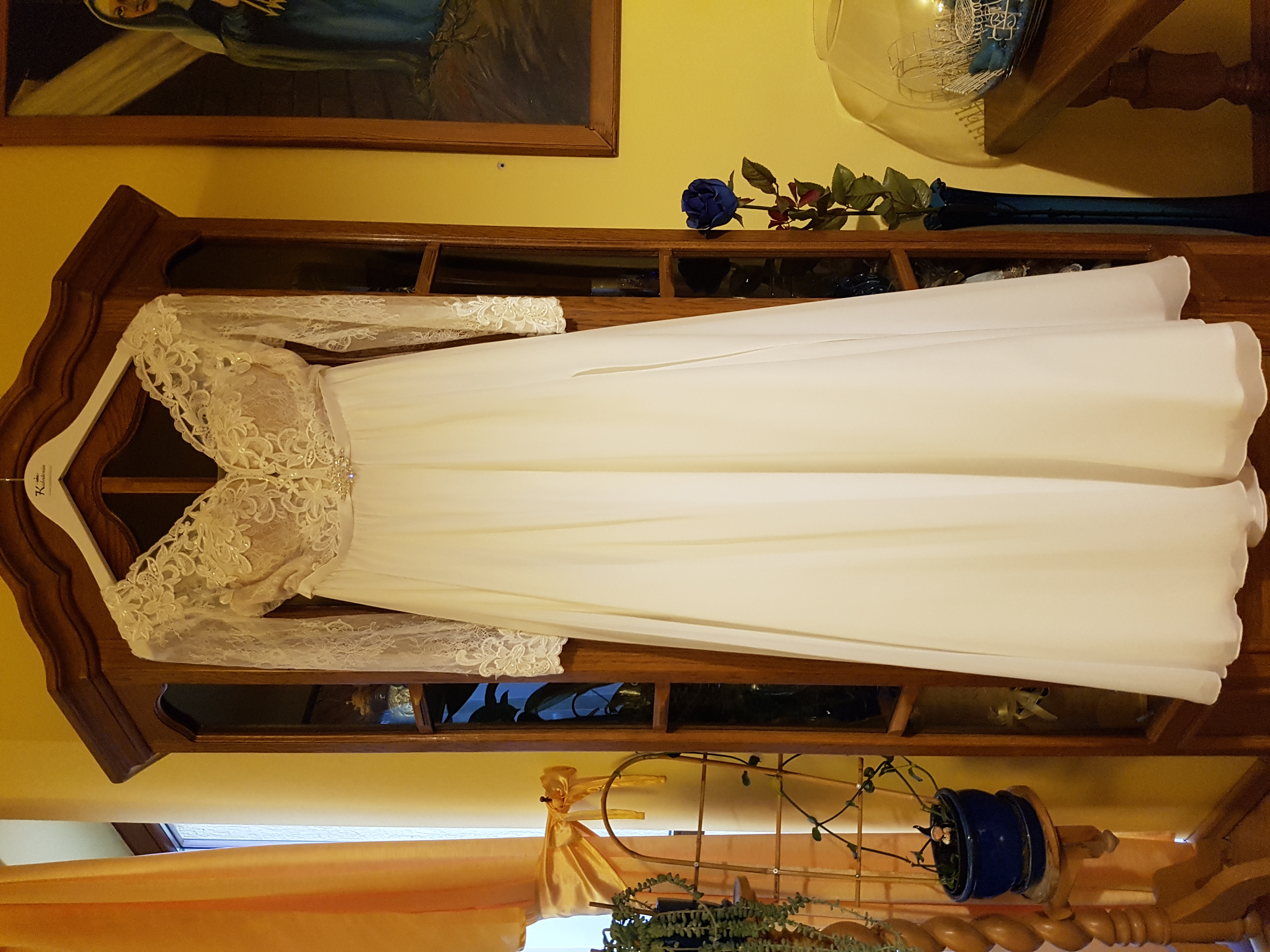 Kolor ecru, piękna i długa, długie koronkowe rękawy zapinane na guziki.