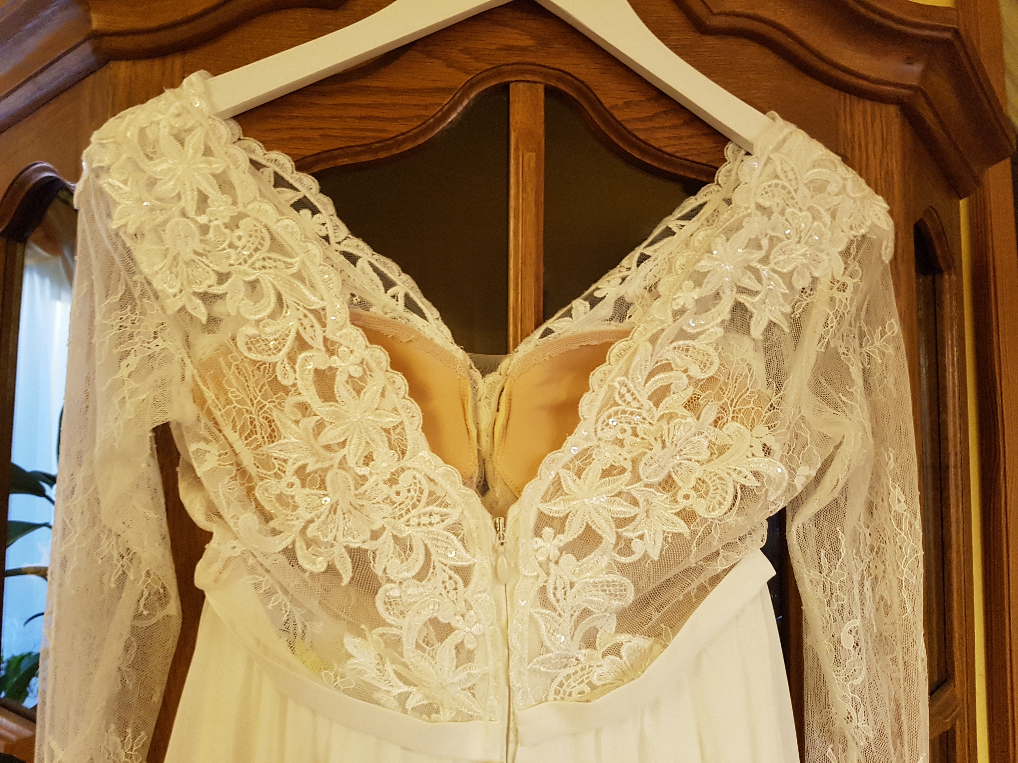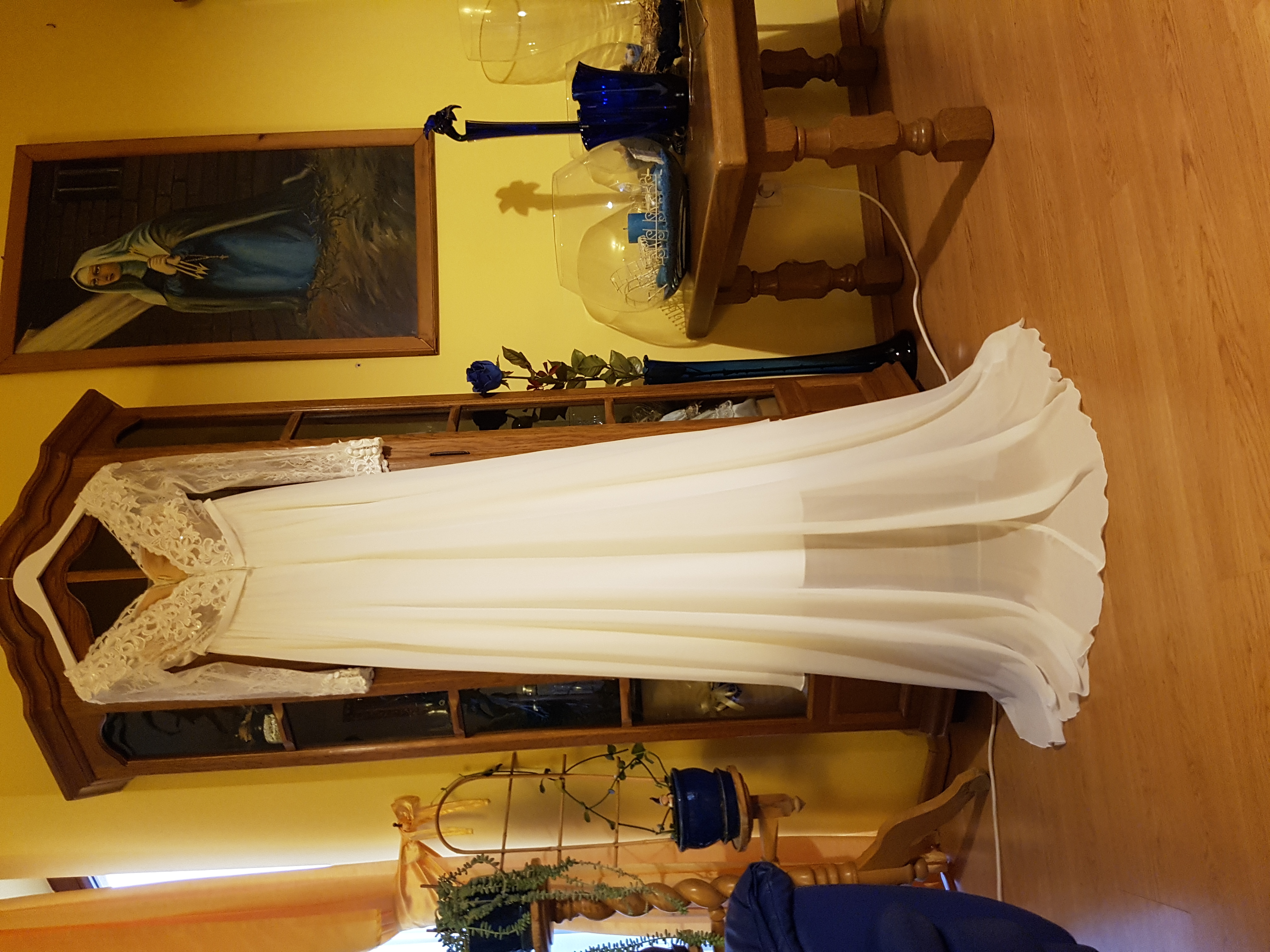 Przód zrobiony z koronki tył pleców w koronie na kształt litery V. Z tylu jest odpinany tren który pięknie się prezentuje na zdjęciach i w trakcie tańca. Dodatkowo jest zostawione trochę materiału na jakieś obróbki, Suknia jest wyczyzczona w specjalnej pralni.