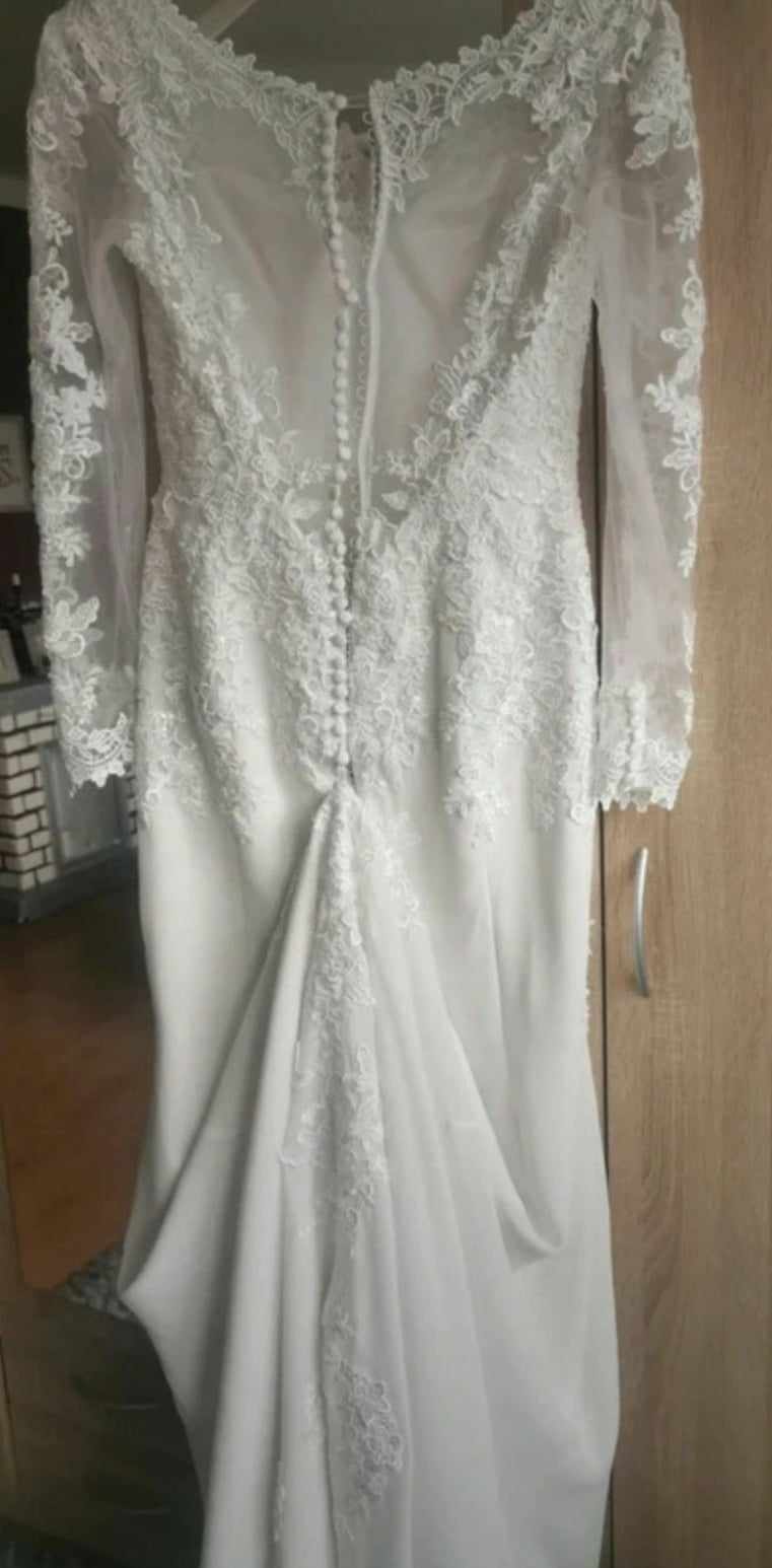 Suknia ślubna NABLA z koronką i delikatnymi cekinami. Bardzo wygodna i piękna suknia koloru ivory o kroju rybki z pięknym rozłożystym trenem, który można podpiąć do tańca i do zabawy. Wygodny i oddychający materiał. Doskonała na ślub, wesele i sesję. Przyciągnie spojrzenia wszystkich ???? kupiona w salonie, założona raz. Bez żadnych wad. Wyprana chemicznie. Możliwość przeróbek: np. skrócenia czy dopasowania do figury. Kupiona w salonie, jednak wiem, że nie sprzedam jej za tyle za ile kupiłam. Dlatego oferuję niższą cenę, by dać jej nowe życie, zamiast kurzyć się w szafie. Możliwość negocjacji ceny. Zachęcam do zakupu;) dokładne wymiary w wiadomości prywatnej, gdzie wyślę komplet zdjęć. Polecam gorąco. Posiadam również welon pasujący do sukni jak w ogłoszeniu. Mogę sprzedać też parasol ślubny koronkowy lub inne dodatki. Informacje w wiadomości prywatnej