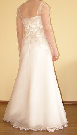 Suknia jest jednoczęściowa + lekkie bolerko, z dopinanymi ramiączkami, zapinana z tyłu na suwak, z usztywnioną częścią górną, bez kół, na halce zszytej z sukienką.