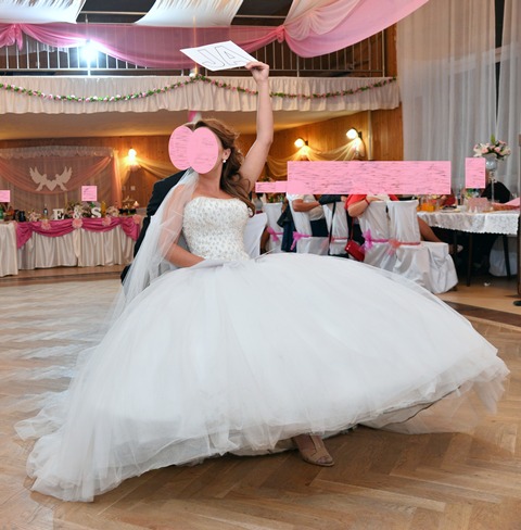 Tył sukni wiązany jest satynową wstęgą, posiada zakładkę dzięki czemu nie musisz się bać jeśli nadmiernie schudniesz/przytyjesz :) Koniec wstęgi chowany jest do wewnątrz.