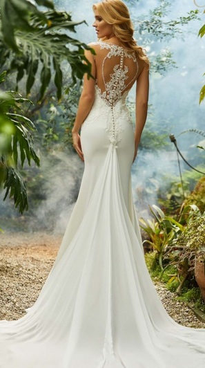 Plecy sukni z tiulu w kolorze cielistym, zapinana na guziczki biegnące przez całą długość pleców.