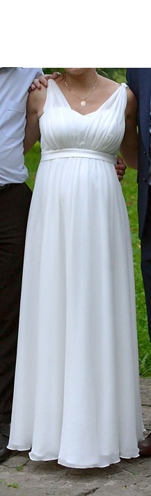 Sprzedam suknię ślubną w stylu greckim, rozmiar S/M, kolor ecru, odcinana pod biustem, zapinana na zamek. Stan bardzo dobry. Sukienka jest nieuszkodzona.