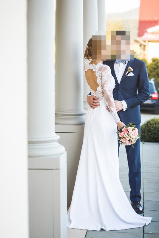 Posiada wbudowany stanik. Bardzo elegancka z koronkowymi rękawami i podpinanym trenem. Pięknie odsłaniająca plecy. Wygodna, nie krępująca ruchów.