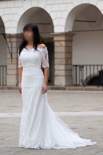 Suknia koloru złamana biel z błyszczącymi kamieniami co widać na zdjęciach, jednoczęściowa z koronkowym bolerkiem (może być noszona w dwojaki sposób z bolerkiem który komponuje się z całością w kształcie łódki lub bez niego z odkrytymi ramionami) po czyszczeniu bez żadnych zniszczeń stan bardzo dobry, obecnie znajduje się w salonie w Nowym Targu i tam też istnieje możliwość przymiarki.