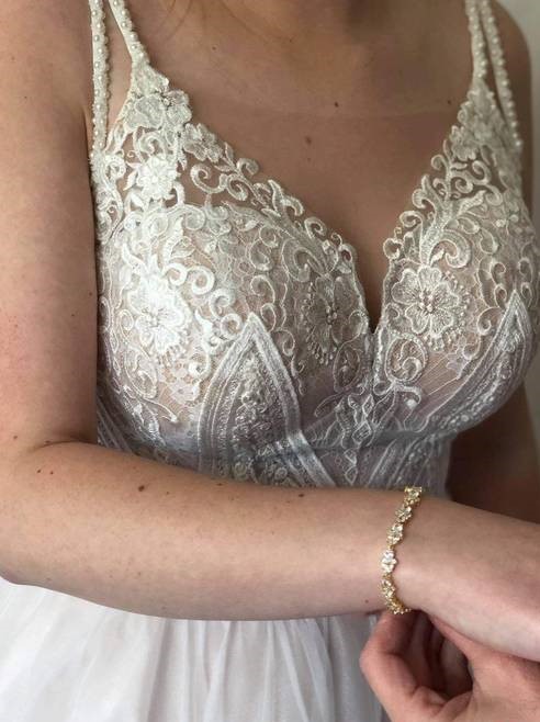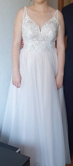 Suknia jest w kolorze białym, góra zdobiona delikatnymi koralikami i perełkami na koronce, dół gładki z jedwabnego tiulu, z jedną warstwą satyny w kolorze nude.