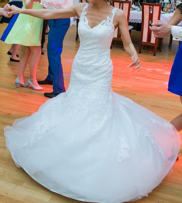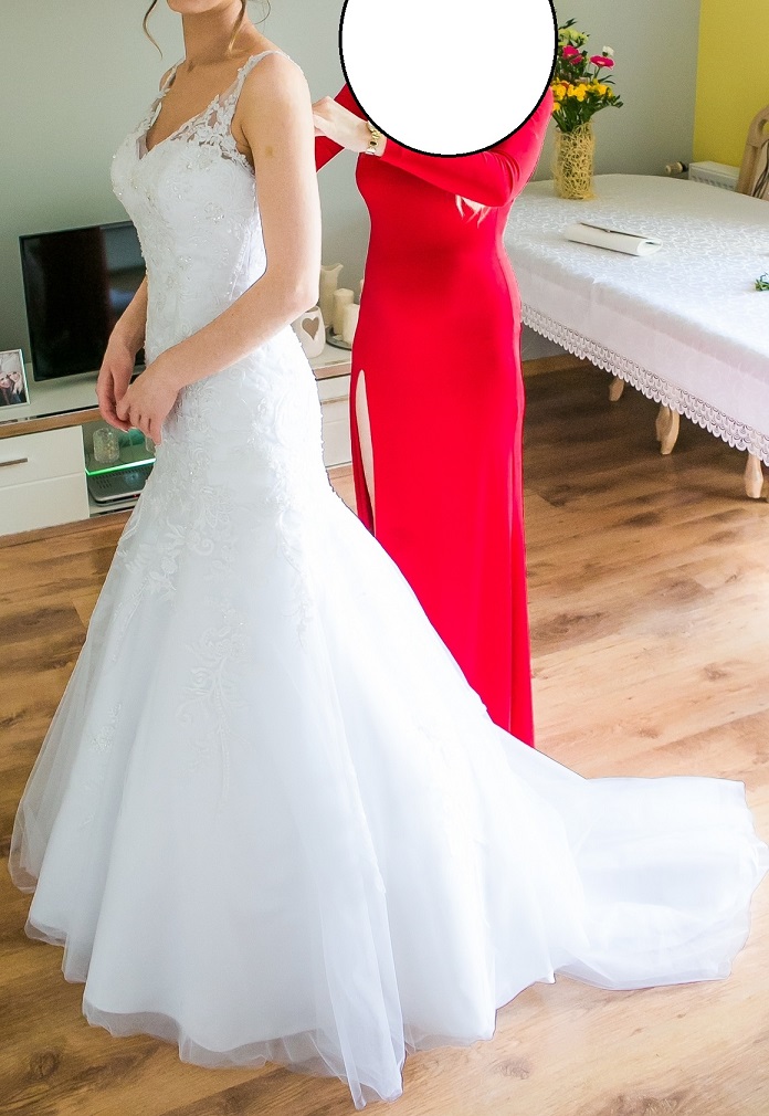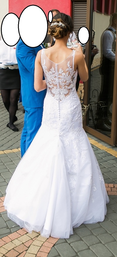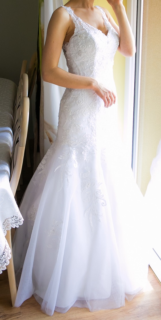 Sprzedam używaną, w bardzo dobrym stanie suknię ślubną. Kolekcja Annais Bridal, linia Ambrosia, model 1601. Fason syreny, dekolt wycięty, wykonany z półprzeźroczystego tiulu, niewątpliwym atutem są plecy zabudowane koronką oraz tren o długości 0,5 m. Sukienka szyta na miarę na wzrost 168 cm, rozmiar 36. Dokładne wymiary dla zainteresowanych opiszę w wiadomości prywatnej lub przez tel. Suknia prezentuje się bardzo gustownie- szyk i elegancja w jednym wydaniu. Polecam kobietom z klasą, które mają wyszukany styl i w dniu ślubu chcą wyglądać inaczej niż przeciętne panny młode.
