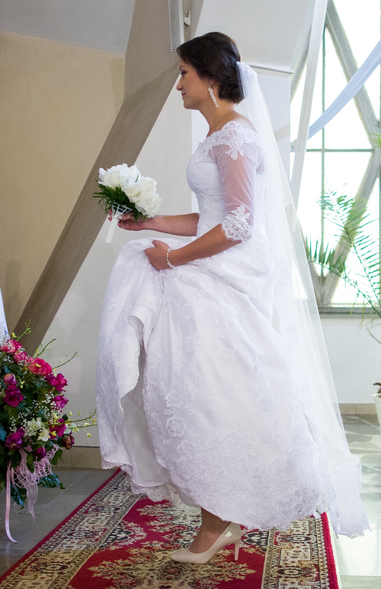 Suknia ślubna z haftowanej koronki + bolerko + welon