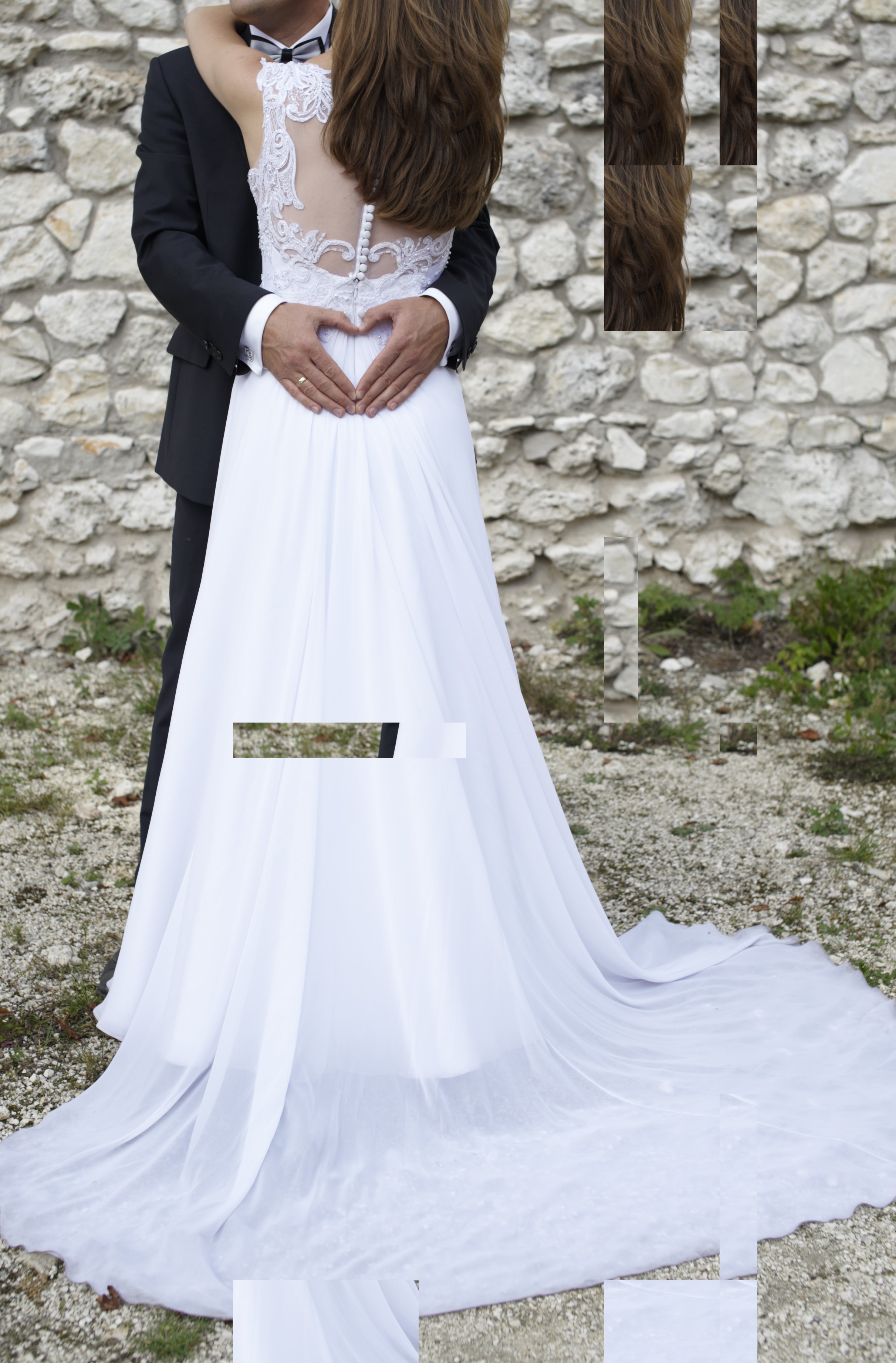 Wszyte miseczki ładnie zbierają biust. Dół sukni gładki, wykonany na wierzchu z delikatnego materiału muślin, pod spodem satyna, góra zapinana guzikami na plecach. Do sukni przynależy osobna halka z fiszbinami i z niewielkim cienkim kołem, która nadaje jej piękny kształt. Suknia jest lekka i bardzo wygodna w noszeniu, nie krępująca ruchów, pięknie układa się w tańcu. Posiada odpinany tren, który może ciągnąć się za Panną Młodą w kościele, natomiast w innych okolicznościach można go łatwo jednym ruchem przypiąć pętelką do guzika. Jest lekki i nie przeszkadza w tańcu. Suknię kupiłam nową, za cenę 2400 zł.