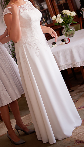 Witam, posiadam do sprzedania piękną suknie ślubną w kolorze ivory firmy Agnes zakupioną w salonie Scarabeo w Warszawie. Model sukni 14133 z kolekcji z 2015 r., jednak na moje życzenie w sukni zrobiono zakrytą górę z delikatnym rękawkiem. Suknia zapinana jest na zamek, zakryty delikatnymi guziczkami, nadaje jej to delikatności i subtelności. Suknia ma kształt litery A, nie posiada wszytych tiuli ani halki dzięki czemu jest bardzo wygodna i lekka, nie krępuje ruchów przy tańczeniu i świetnie sprawdzała się w upalny dzień.