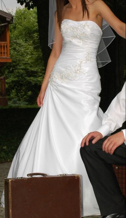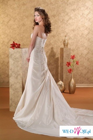 Sprzedam suknię z kolekcji Euro Bride model 3903. Rozmiar 36/38, wzrost 172 + obcas 4 cm, kolor biały. Polecam ten model, gdyż jest on bardzo lekki i wygodny. Suknia uszyta jest z białej tafty, jest jednoczęściowa (linia A), z prostą spódnicą, z długim trenem , który można podpiąć. Tafta ma delikatnie perłowy połysk w słońcu lub przy sztucznym oświetleniu. Prezentuje się ona naprawdę wspaniale: górna część sukni jest pięknie zdobiona - są to hafty z motywami kwiatowymi, z naszytymi białymi, przezroczystymi i srebrnymi koralikami oraz cekinami. Jej dużą zaletą jest sznurowany gorset, dzięki czemu sukienka dopasowuje się do każdej sylwetki: wiązanie podkreśla talię i niesamowicie wysmukla. Ramiączka są odpinane. Suknia nie posiada żadnych wad, jest po czyszczeniu w profesjonalnej pralni chemicznej i wygląda jak nowa. Dlatego gorąco zachęcam do zakupu.
