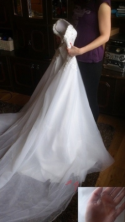 Tiul uległ nieznacznemu uszkodzeniu. Jest po naprawie, na całości nic nie widać. Wszystko jest zamieszczone na zdjęciach. Suknię można obejrzeć w Jankach, pod Warszawą.