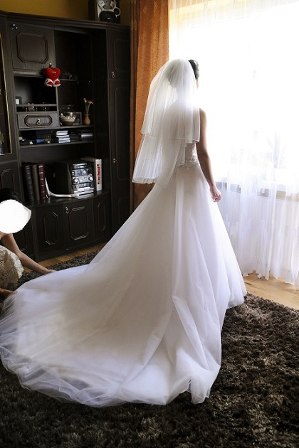 Po podpięciu wygląda, jakby była dodatkowa warstwa sukni. Suknia zamiast koła ma kilka warstw tiulu dzięki temu super się układa. Dodatkowo oczywiście dołączam welon.
