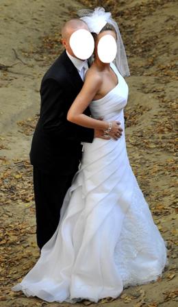 Piękna suknia ślubna w kolorze białym zakupiona w salonie Sposabella, model 785. Suknia była szyta na wzrost 162+obcas. Śnieżnobiała, jednoczęściowa, z organtyny, w poprzeczne plisy zbiegające w efektownie układający się tren z możliwością podpięcia. Gorset sznurowany, u dołu sukni piękna koronka ozdobiona koralikami i kryształkami, dodatkowo halka na kole i bolerko. Możliwość przymiarki w Kozienicach, woj. mazowieckie. Serdecznie polecam!