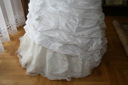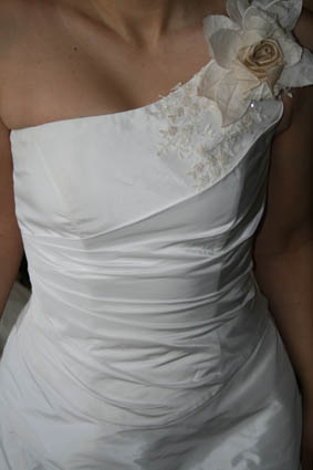na ramieniu kwiat – drugi taki sam do wpięcia we włosy, na dole sukni przepiękna koronka. Używana raz, uprana w pralni. Stan bardzo dobry. Welon gratis.