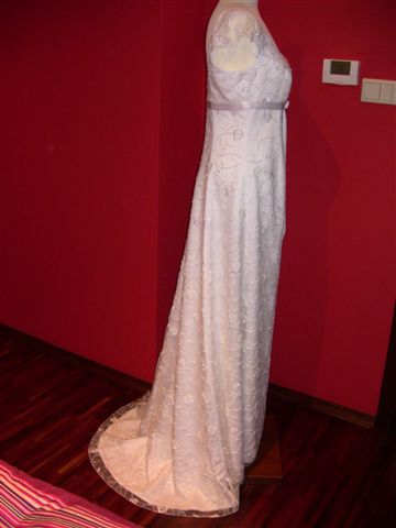 Fason sukni tzw "józefinka", suknia cudownie układa się na figurze i jest pięknie zdobiona.
