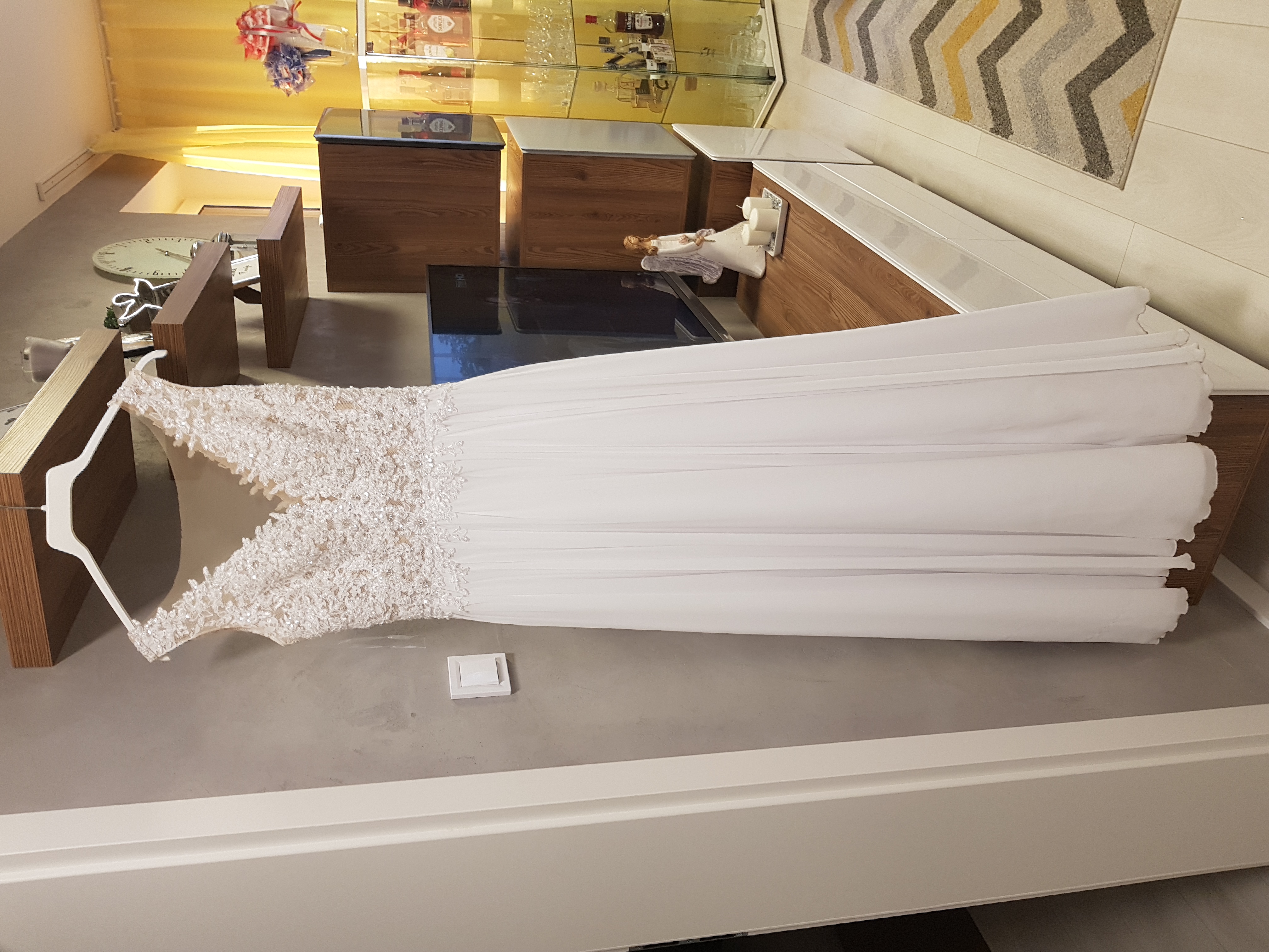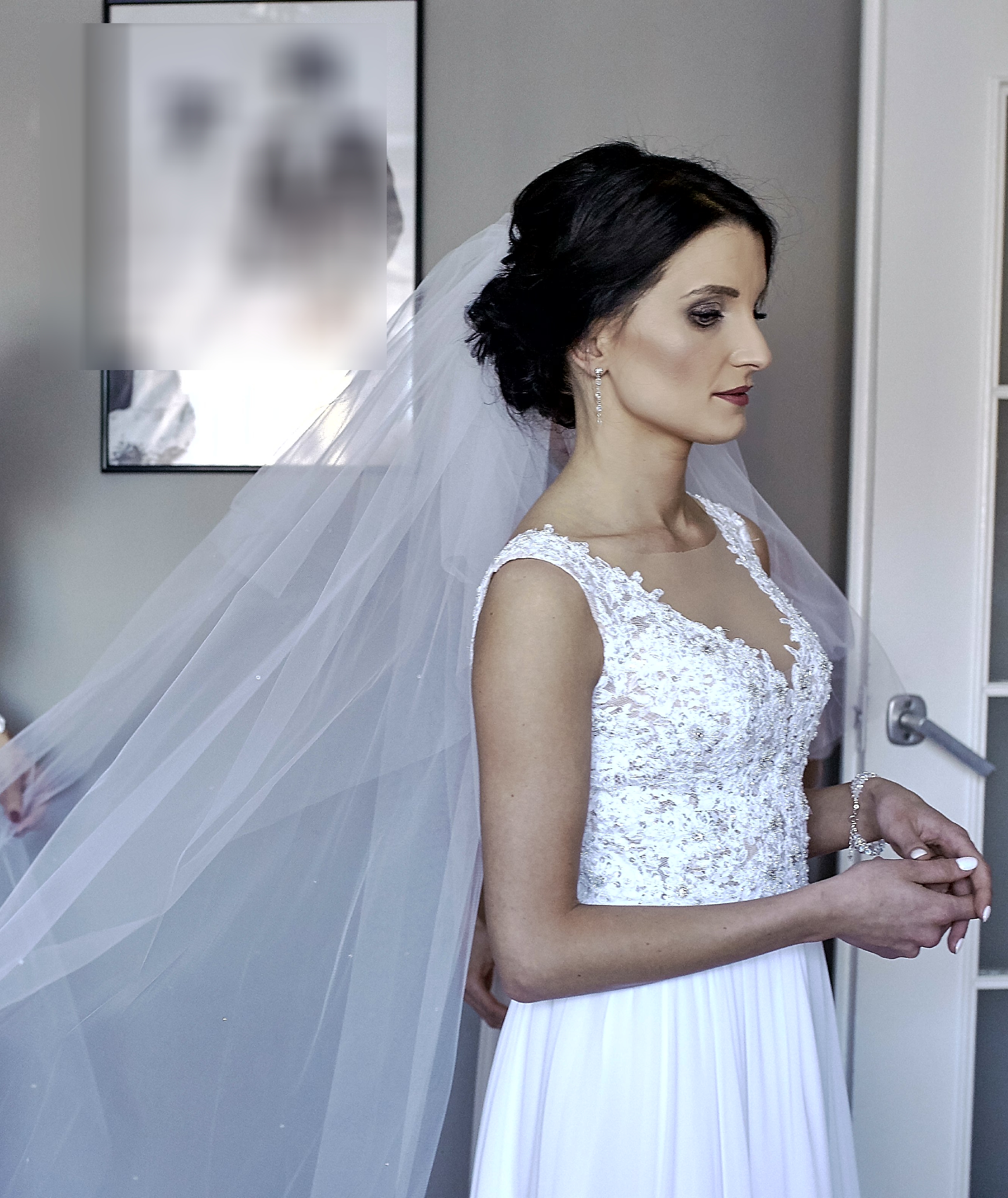 Góra wykonana jest ze starannie uszytej koronki a dół sukienki jest z lekki i zwiewny. Cała sukienka jest w kolorze śnieżnobiałym. Moja sukienka jest wyjątkowa, ma dwa z przodu i z tyłu dekolt w literę V i nie ma pod spodem koronkowej spódniczki . Suknia zapinana jest na suwak.