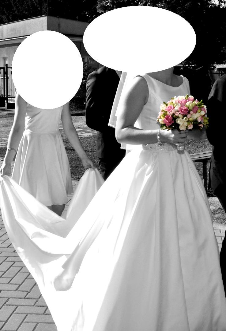 Suknia jest śliczna, klasyczna, śnieżno biała, z pięknym dekoltem na plecach, w talii naszyto bogato wyszywany pas z kryształków zakończony z tyłu uroczą kokardką z szarfami. Tren podpinany dla wygody w tańcu tworzy piękne wykończenie z tyłu spódnicy.