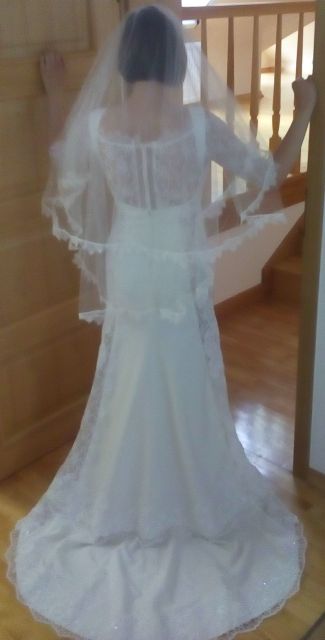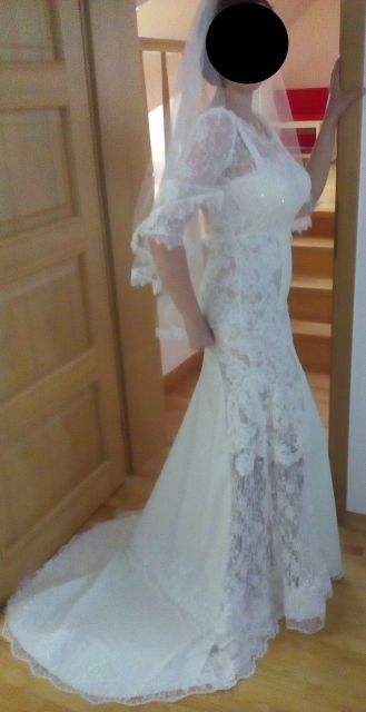 Sprzedam piękną suknię ślubną w bardzo dobrym stanie, w kolorze ecru z dodatkami. Suknia została uszyta z połączenia niegniotącej się gabardyny i miękkiej koronki. Suknia ma wbudowany gorset obszyty gabardyną i dekoracyjną koronką z maleńkimi koralikami. Z przodu i tyłu sukni jest gabardyna w kształcie trapezu wykończona dekoracyjną koronką, a po bokach sukni jest koronka podszyta cielistym materiałem (cielisty materiał jest do kolan) w kształcie trapezu także wykończona dekoracyjną koronką. Suknia rozszerza się delikatnie na wysokości uda. Dodatki do sukni: tren dopinany na rzepy obszyty identycznie jak suknia, bolerko z koronki takiej samej jak na bokach sukni oraz welon obszyty koronką. Suknia i bolerko są zapinane na suwak. Suknia jest bardzo wygodna i ładnie się prezentuje. W tańcu wiruje wokół nóg. W salonie sukien ślubnych cena tej sukni to 4500 zł.