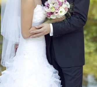 Subtelna suknia ślubna a la hiszpanka. Elegancka, delikatna, efektowna jednoczęściowa suknia ślubna z trenem. W zestawie nieużywane rękawiczki i bolerko.