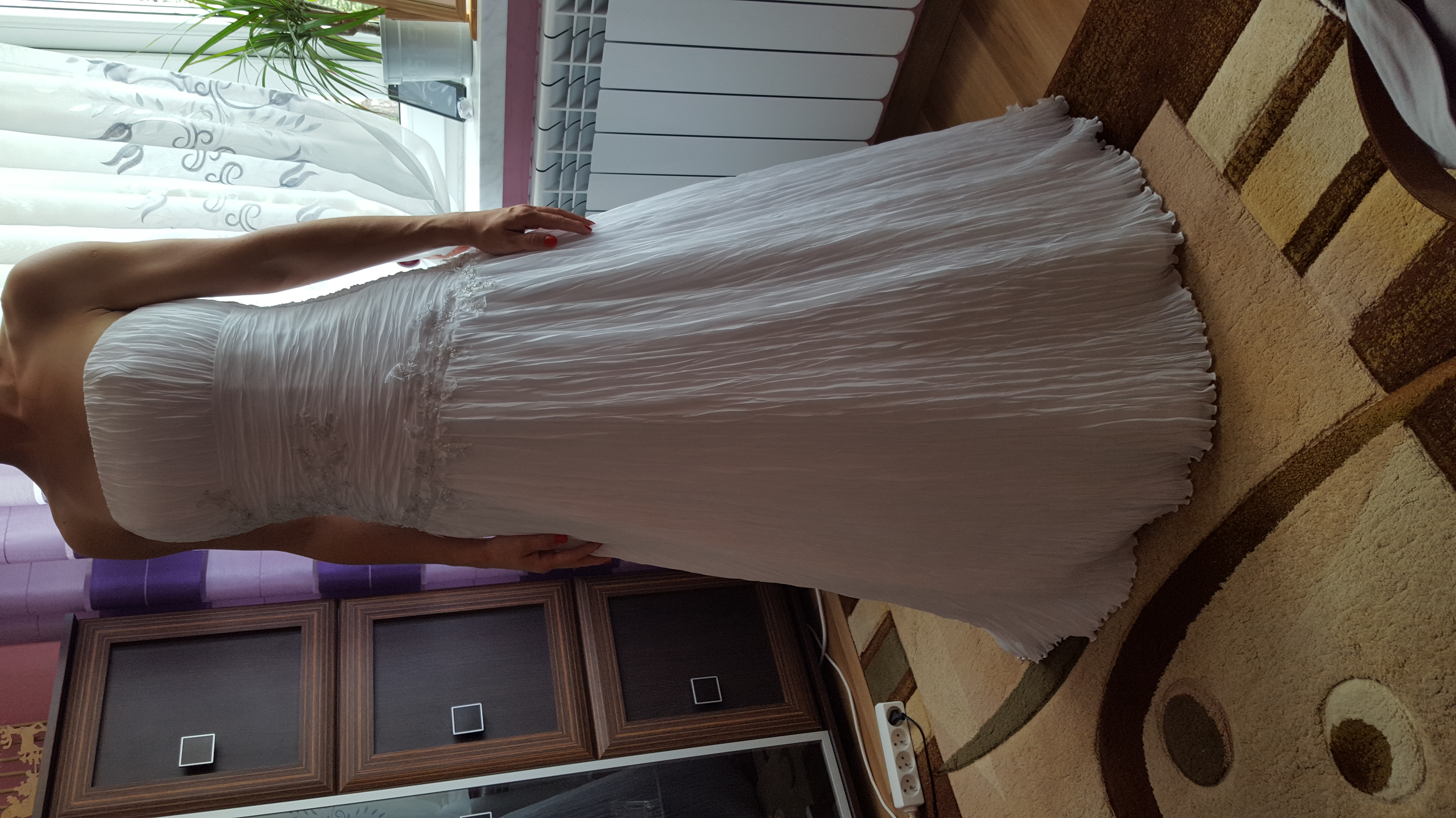 Sprzedam jednoczesciowa elegancka suknie slubna firmy Agnes w kolorze bialym,gora zapinana z tylu na guziczki,dol pieknie plisowany. W zestawie halna na kole sredniej wielkosci,suknia na wzrost 160cm+obcas