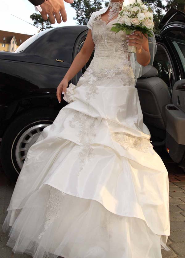Do sukni dołączam gratis: welon, rękawiczki, diadem, koronkę na szyję, męską kamizelkę ślubną pasującą do sukni.