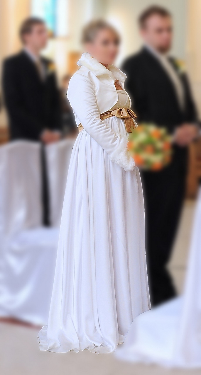 Suknia doskonale tuszuje brzuszek, dzięki marszczeniom pod biustem, oraz niedoskonałości ramion dzięki koronkowym rękawom. Ma wszytą halkę, jest zapinana z tyłu na zamek, oraz guziczki.