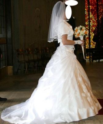 Do sukni dołączę bolerko, rękawiczki, opakowanie pończoch i welon.