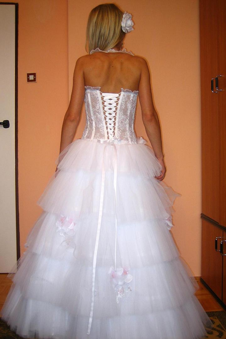 Suknia ślubna rozm. 36-38, piękna biel, jednoczęściowa - z tyłu regulowana, góra z koronki, na szyi dopinana falbanka, dół z falban tiulowych zdobiony kwiatami z delikatnego różu. Jestem jej pierwszą właścicielką, ma stan idealny i została wyprana. Serdecznie zapraszam na przymiarki w Radomiu. Więcej zdjęć wyślę na e-mail