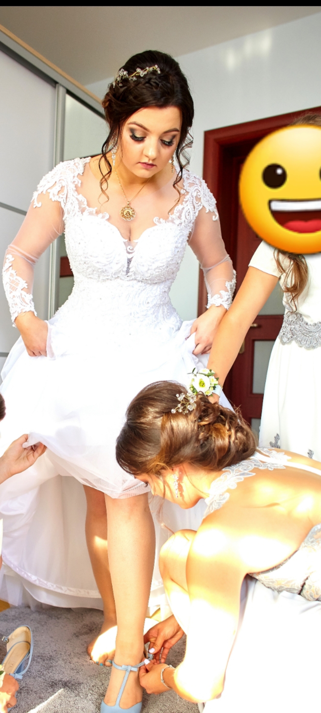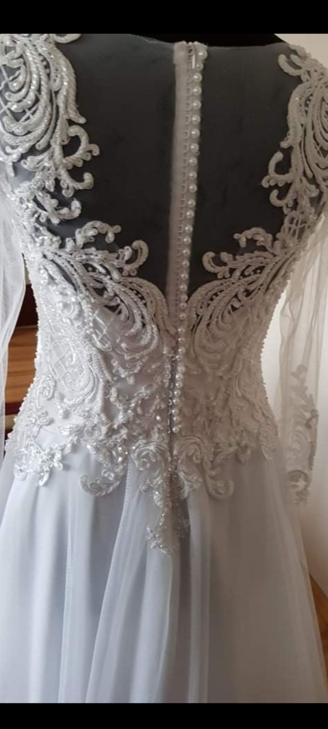 Suknia Ślubna zdobiona gipiurą i oraz koralikami które nadają piękny blask, suknia wszyty ma gorset do regulacji tali, mozwisoc skrócenia, welon w zestawie . Zapraszam na priv po więcej informacji . Cena do negocjacji